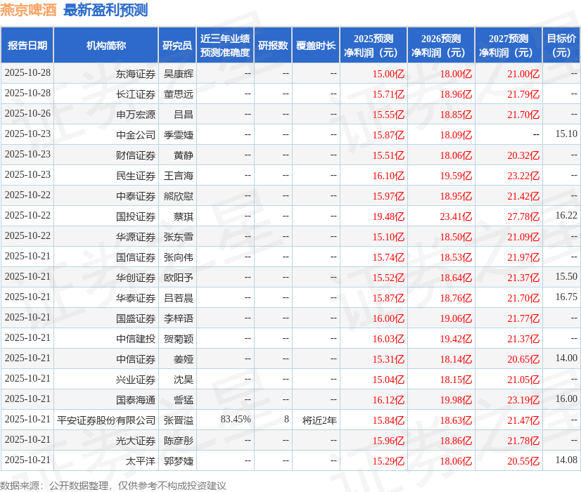 证券之星动静,2025年11月4日燕京啤酒(000729)发布通知布告称公司于2025年11月4日接管机构调研,广发证券符蓉 郝宇新、信达澳亚基金于非禾、长江资管丰一凯、新华基金夏旭、华美国际投资齐备、鑫巢本钱许科 刘力铜、工银瑞信张玮升、华富基金王叶、泓德基金郑名洋、泰康基金郭嘉熙、兴业证券资管邱思佳、易方达黄逸群 易俊何、阳光资产红、摩根士丹利基金苏剑晓、国华兴益安全韩冬伟、汇丰晋信李文华、汇添富杨瑨 田立、大师资产王辉 李德宝、景顺长城肖峰、景林资产高翔、国泰基金智健、鹏扬基金曹敏、太保资产白嘉怡、深圳国源信达李淑圆、中泰资管陈太中、鹏华基金李树培、建信基金王麟锴、上海从容投资陈欣蕊、招银理财王颖青、英大安全资管周载芟、国联安基金王兴伟、兴业证券汪润、中金资管王凯、MillenniumBeckyLu 李诗娇、华能贵诚信任张敏琦、国投瑞银冯新月、银河基金于嘉馨、华安证券韦喷鼻怡、博迈基金黄亚铷、NorhrockHoward Yang、Point72金明、承平资管孙宛、安联基金赵耀 KevinZHAO、光大资管房俊、汇安基金王苏煦参取。答:公司积极摸索品牌立体化、多元化营销径,通过系统性资本整合取场景化立异,持续赋能品牌价值提拔及市场所作力建立,进一步夯实“中国人本人的啤酒”品牌定位,放大品牌焦点价值。通过建立内容营销系统,开展多样化种草勾当,打制前言矩阵,实现全国赋能取区域全面笼盖。用好品牌代言人,区域和集团层面三大模块品牌推广,鞭策品牌年轻化、时髦化、高端化升维。答:公司以党建为引领,加大深度、拓展广度、提拔精度、温度,正在质量、销量、动力和办理上持续发力,不竭加强企业焦点合作力、立异力、节制力、影响力和抗风险能力。公司持续聚焦从业、加强市场开辟,啤酒出产及发卖营业占公司从停业务的 90%以上,外行业全体承压的布景下,财政表示持续提拔,实现了业绩的强势冲破。2025 年 1-9 月,公司实现啤酒销量 349。52 万千升(含托管运营),同比增加 1。39%;实现停业收入 1,343,282。98 万元,同比增加 4。57%;实现利润总额 240,360。16 万元,同比增加 36。18%;实现归属于上市公司股东的净利润 177,045。53 万元,同比增加 37。45%。答:公司高度注沉推进数字化扶植,不竭运营办理程度。公司数字化转型蓝图规划思日益清晰,有序推进集团管控平台及环节营业范畴数字化系统扶植,做好既有平台运维和系统优化,加强数据管理取使用,勤奋打通产-供-销-财链协同,沉淀数字化能力。“十四五”收官正在望。客岁底,我们便动手进行“十五五”规划的务虚,年后正式启动“十五五”编制工做,同时也对“十四五”进行全面评估。这两项工做正正在有序推进中。“十五五”规划虽没有成型,但正在内部曾经告竣初步共识。颠末四年多的勤奋,燕京的业绩一年一台阶,我们有决心告竣既定的“五和五胜”方针。下一个五年,我们要持续实现业绩增加,愈加积极地提高增加质量,淬炼成长成色,做优做强。问:关于推进供应链韧性升取生态协同能力扶植答:公司按照“十四五”供应链数字化规划,系统推进供应链韧性提拔取生态协同能力扶植。正在手艺架构层面,整合出产、采购、物流等焦点模块,搭建协同平台,从平安、合规、供应商赋能维度完美供应链办理,确保原材料来历可逃溯、质量可管控,为食物平安取合规运营供给保障,取焦点供应商构成“风险共担、好处共享”的持久合做关系,为可持续成长奠基根本。燕京啤酒(000729)从停业务:啤酒、饮用水、啤酒原料、茶饮料、酵母、饲料等产物的制制和发卖。燕京啤酒2025年三季报显示,前三季度公司从营收入134。33亿元,同比上升4。57%;归母净利润17。7亿元,同比上升37。45%;扣非净利润16。85亿元,同比上升33。59%;此中2025年第三季度,公司单季度从营收入48。75亿元,同比上升1。55%;单季度归母净利润6。68亿元,同比上升26。0%;单季度扣非净利润6。49亿元,投资收益97。41万元,财政费用-1。61亿元,毛利率47。19%。该股比来90天内共有29家机构给出评级,买入评级22家,